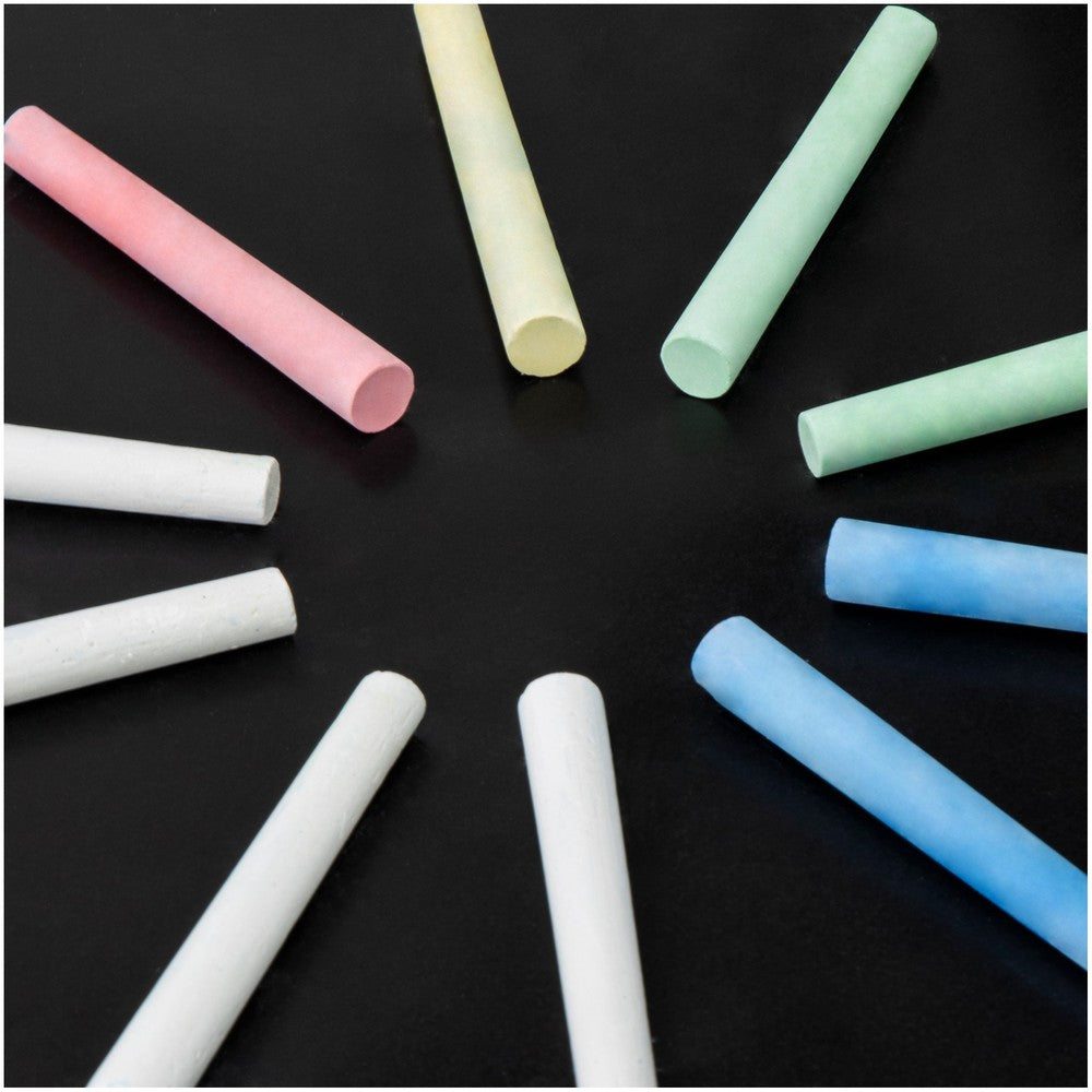 Pack of 10 quality chalks in 5 different colours. Includes 4 white, 2 blue, 2 green, 1 yellow and 1 pink. Ideal for chalkboards.