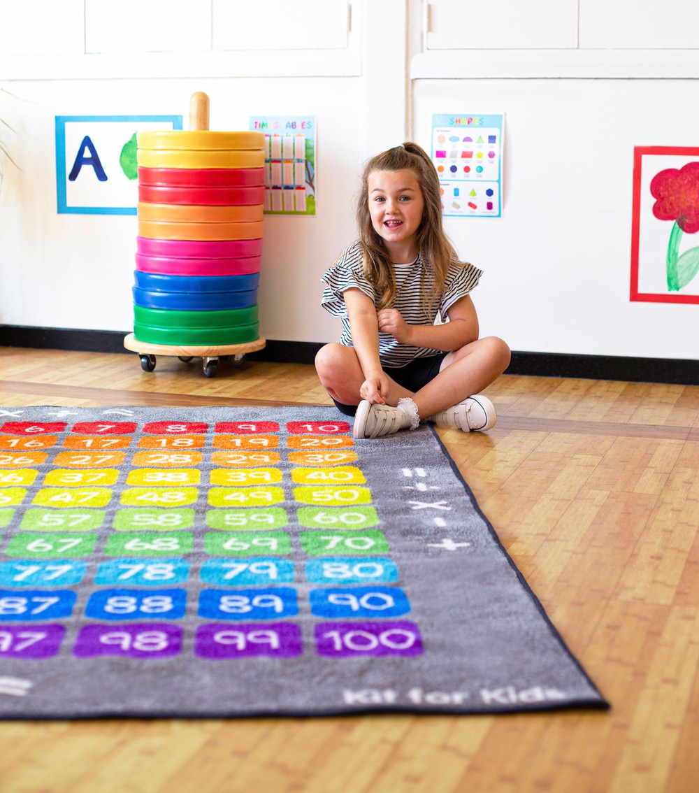 The Vibrant 100 Square Counting Grid Carpet, a specially designed 2x2m educational tool tailored to the Key Stage 1 Numeracy Curriculum. This colourful carpet is perfect for group maths activities and serves as an engaging introduction to arithmetic.