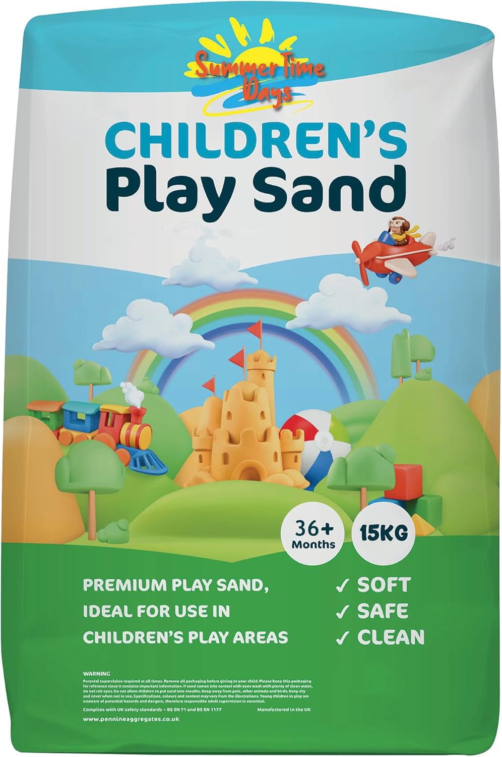 PRODUCT SPECIFICATIONS This is Approx 15KG Bag of Play Sand. Complies with toy safety standards BS71 Parts 1 2 and 3. Specially washed graded and blended Non-toxic Non Staining Clean and Safe. Health and Safety. If in contact with eyes wash out with clean water. Do not put sand in your mouth. Adult supervision recommended for very young children. To avoid danger of suffocation keep bags away from children.