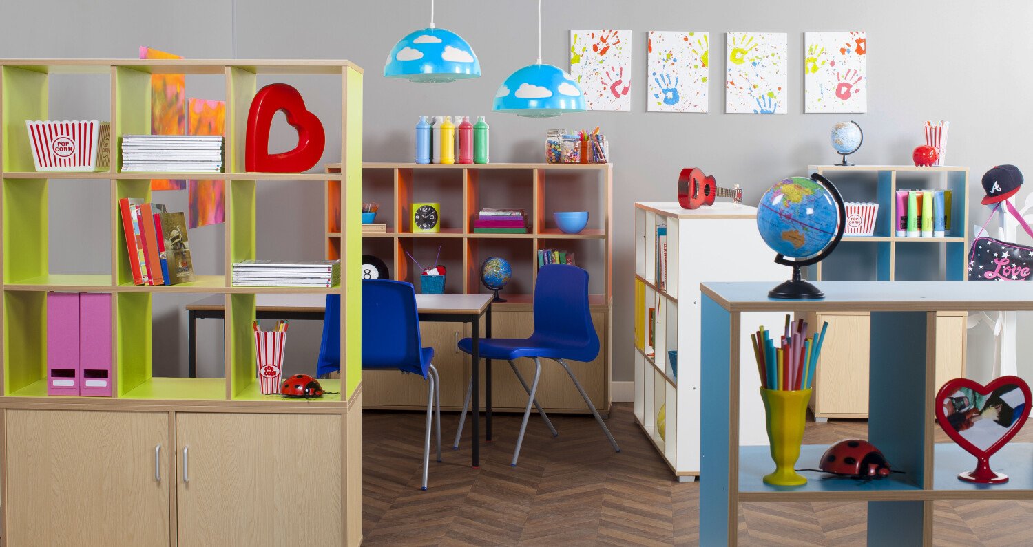 Bubblegum backless room dividers are available in different colours and number of bays, they are manufactured from MFC with ply effect edging. The room divider units can be connected to a range of low level cupboards. Ideal for early years where a separate section of the classroom is required. Supplied with a set of plastic feet and connecting pins. Finish in Maple MFC with Tangerine, Lime or White Internal and External Finish. Safety note: although these units are designed to be stacked we do not recommend they exceed 2 meters in height when stacked.