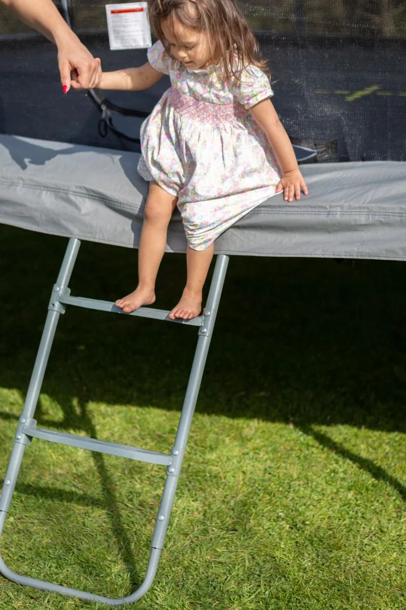 With a sturdy rectangular shape, it provides even bounce distribution, making it ideal for kids perfecting their jumps. The cool grey surround pad covers the strong 5.5” galvanised steel springs, ensuring little fingers and toes stay protected. Plus, it comes with a deluxe grey ladder and tie-down kit, so getting on and off is as easy as bouncing!