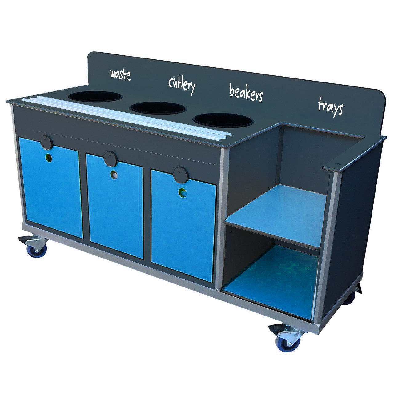With clearly labelled compartments for Waste, Cutlery, Beakers, and Trays, the trolley encourages independence and responsibility, making it a fabulous resource for early years, KS1, and beyond. It features handy cupboard doors with secure catches, a tray shelf on one end, and a hygienic, wipe-clean finish to keep things sparkling. Plus, it glides smoothly on locking castor wheels—so you can wheel it out when needed and tuck it away when you're done!