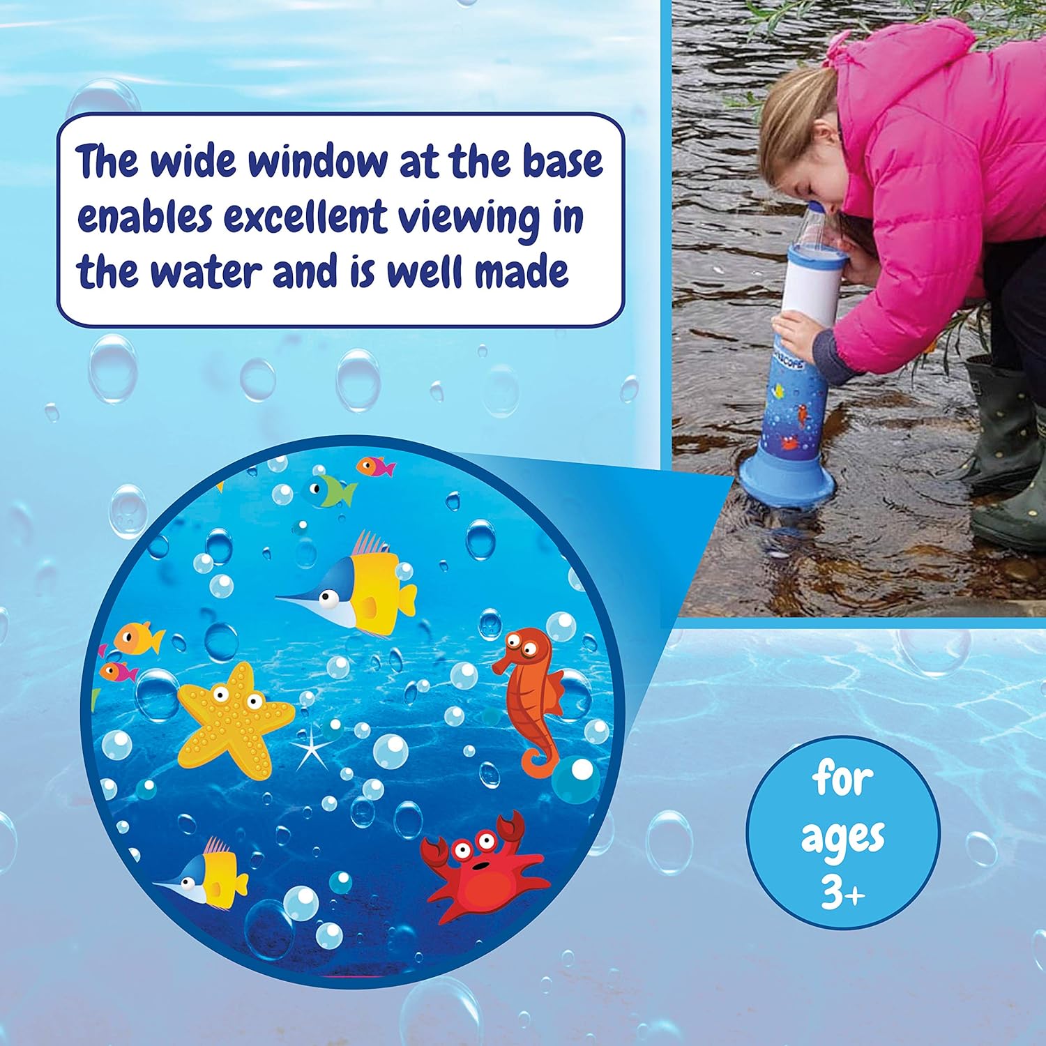 Dive into discovery, without getting wet! The Aquascope is the perfect tool for curious young explorers to get a close-up look at underwater life. Whether it's pond dipping in the park, exploring a rockpool, or investigating marine plants and creatures in a stream, this award-winning Aquascope brings the underwater world to life.