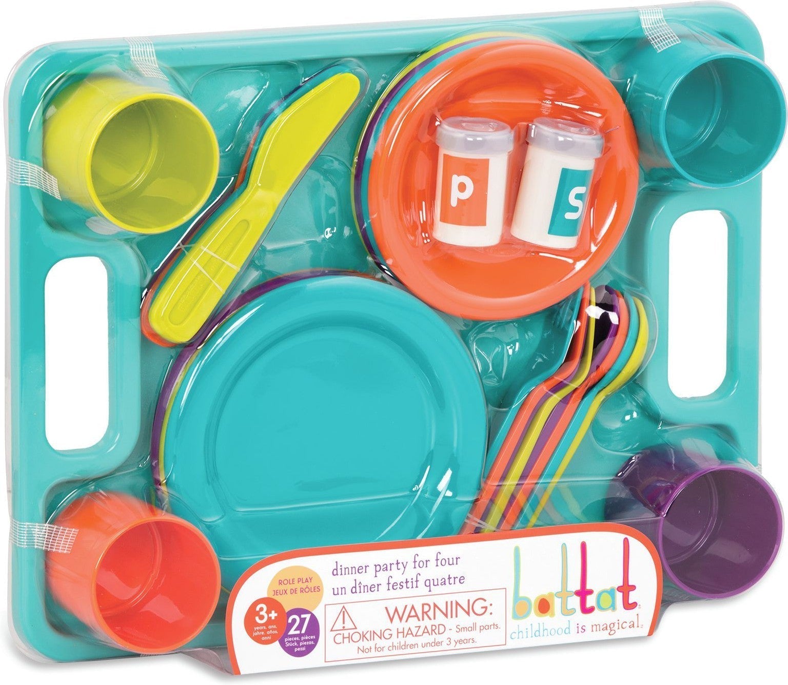 Throw a fabulous dinner party with the Battat Dinner Party for Four! This charming 27-piece set is perfect for little hosts and hostesses to entertain their guests. With durable, break-resistant, and dishwasher-safe pieces, it’s ideal for sparking imaginative role play. Designed with chunky, easy-to-hold utensils and tableware, this set encourages creativity and social skills.