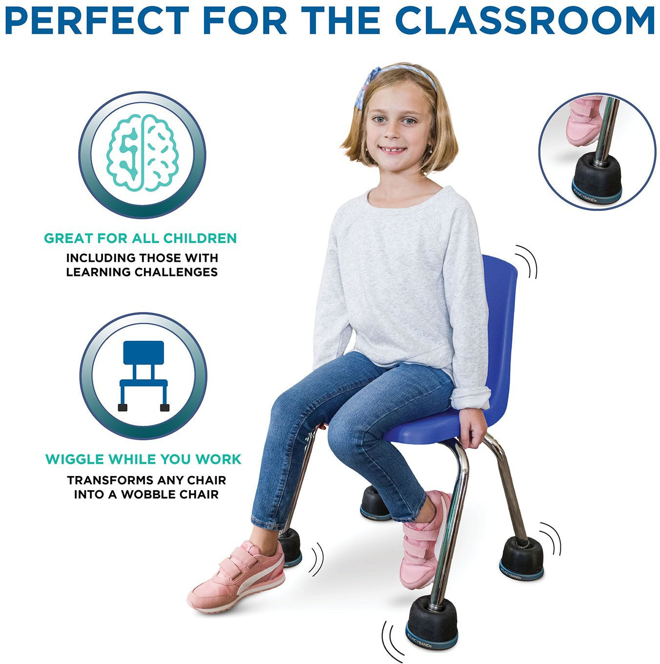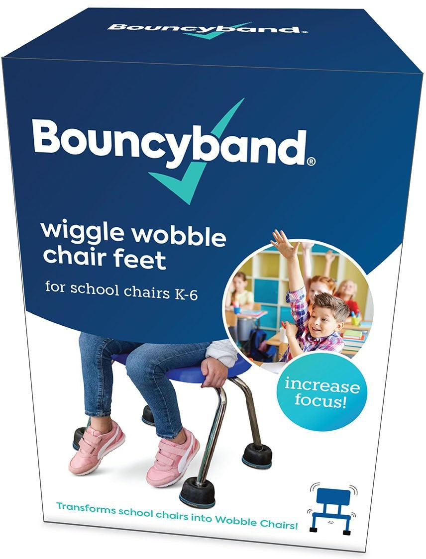 Patented Wiggle Wobble Chair Feet transform a standard school chair into a Wobble Chair enabling kids to have an outlet for excess energy while working, alleviating anxiety, hyperactivity and boredom.