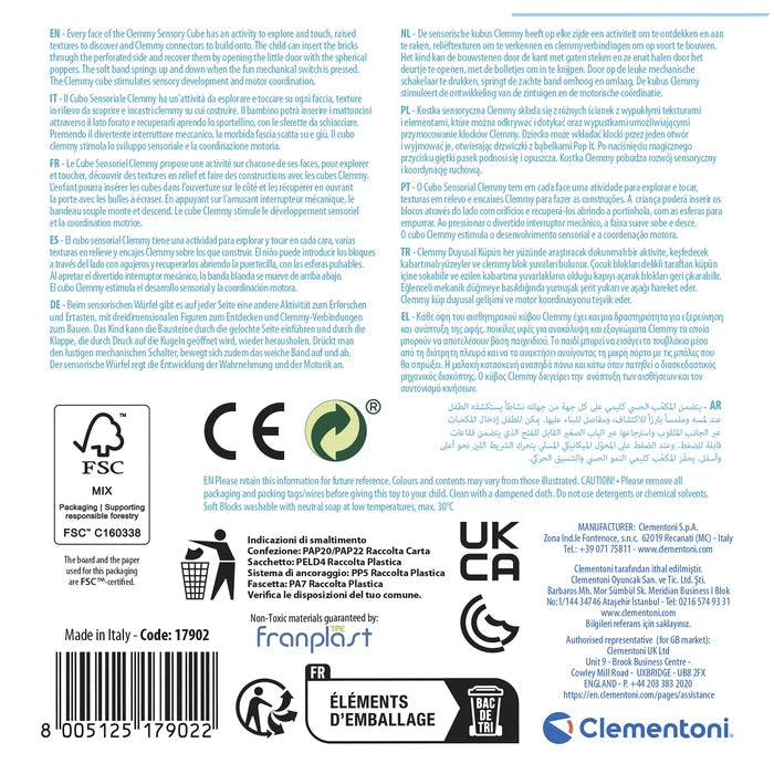 With 4 ultra-soft Clemmy blocks included, babies can stack, squeeze, and explore to their heart’s content! Made in Italy and crafted with safety in mind, this cube provides endless multisensory fun and learning opportunities for your little one.