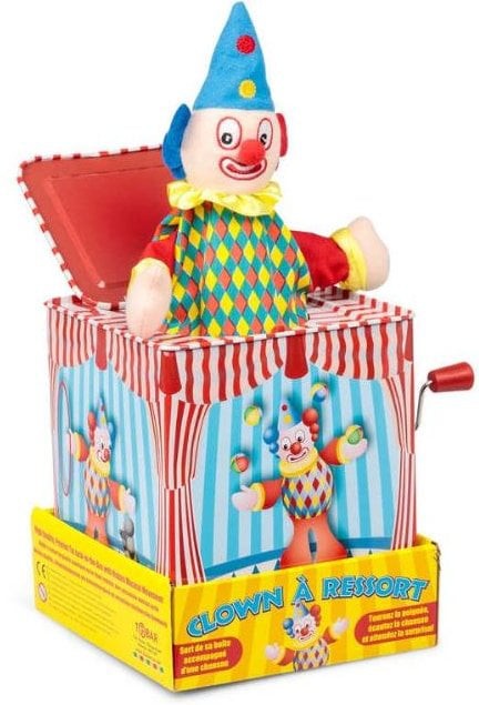 Clown Jack-in-the-Box with traditional metal boxTurn the handle on this adorably designed box and it ll play a jolly rendition of Pop Goes the Weasel. Don t get too content though as pretty soon a cute Clown figure will pop out of the box with their arms outstretched. To reset the mechanism all you have to do is push the clown carefully back into their box and close the lid.