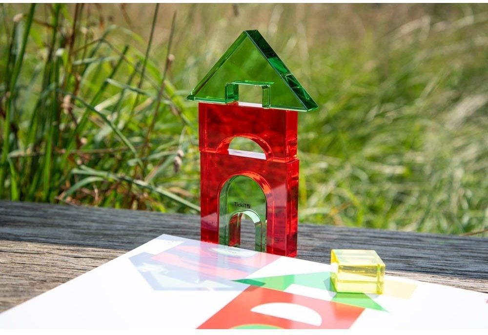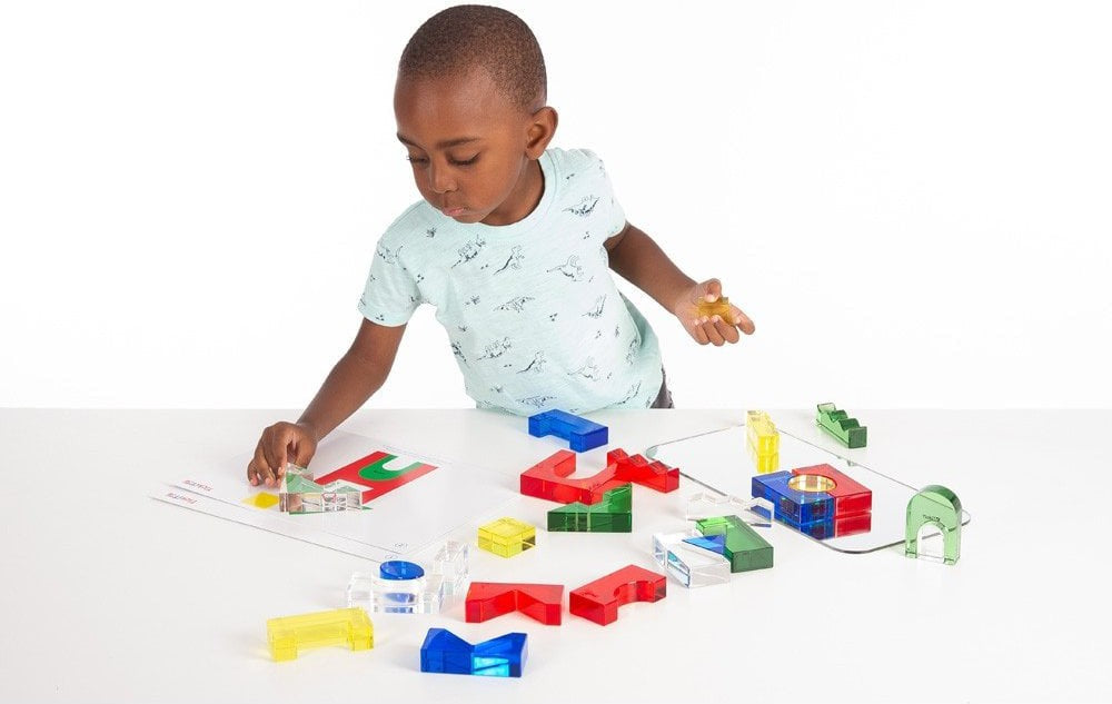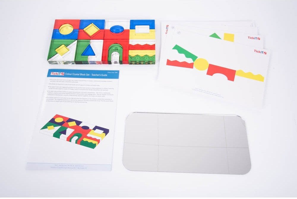 Beautifully polished translucent acrylic blocks in different shapes with a plane mirror 15 work cards and teachers notes included. The smooth colourful tactile blocks are designed to enable children to explore light & colour build patterns and sequences as well as create imaginative pictures.
