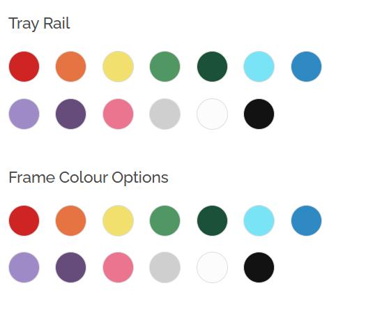 Available in a range of bright powder coat colours for the frame and tray rail – just let us know your preferred combo!