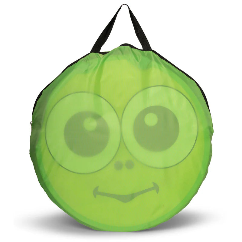 Pop up play tunnel with a colourful bug design. Simply remove it from the carry case and the tunnel instantly takes shape, with its multi-coloured body extending to reveal a set of legs on either side. The end of the tunnel features a zip door that has a smiling face with big bulging eyes, as well as a pair of antennae on its head. It's ideal for play, both indoors, and outside in the garden.