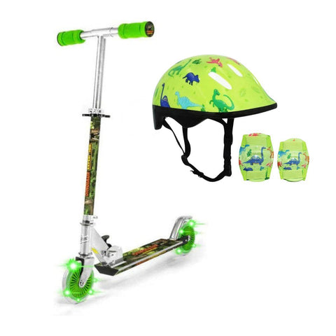Start scootin' like a dino and the LED lights on these wheels will start showin' - illuminating the front and back of the scooter! With a two-wheeled design, adjustable handlebars, and a rear foot brake for extra control, this light-up scooter with a prehistoric vibe is perfect for kids learnin' to scoot. Plus, it folds down flat so it's easy to stash and transport—dinomite!
