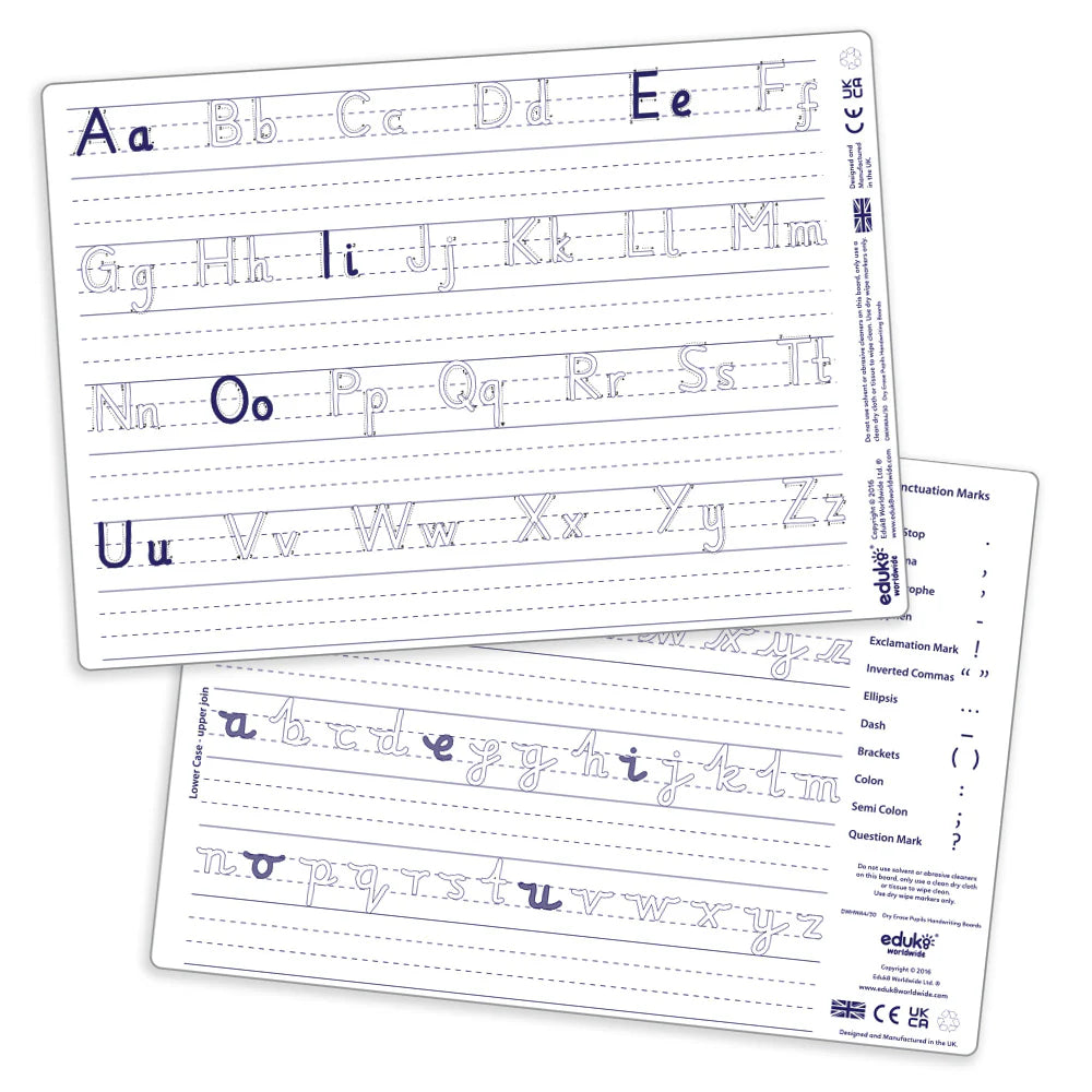 Bring handwriting practice to life with the Dry Erase Handwriting Boards Pupils A4 – Pack of 30! Perfect for busy classrooms and literacy corners, these double-sided boards are designed to help children develop beautiful letter formation with confidence. Featuring numbered sequences, guide lines, and handy punctuation references, they're a brilliant tool for practising both joined cursive and upper/lowercase alphabets.