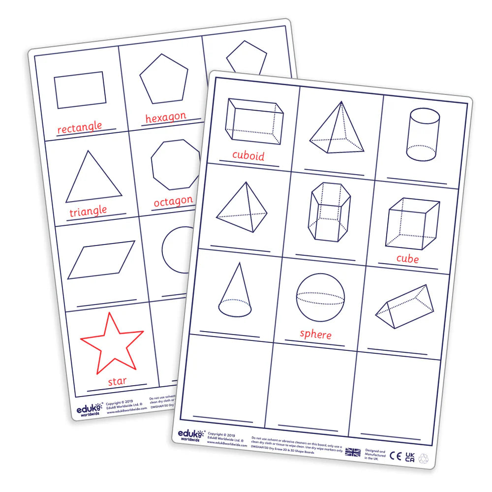 • Set includes: 30 double-sided A4 dry erase 2D/3D shape boards