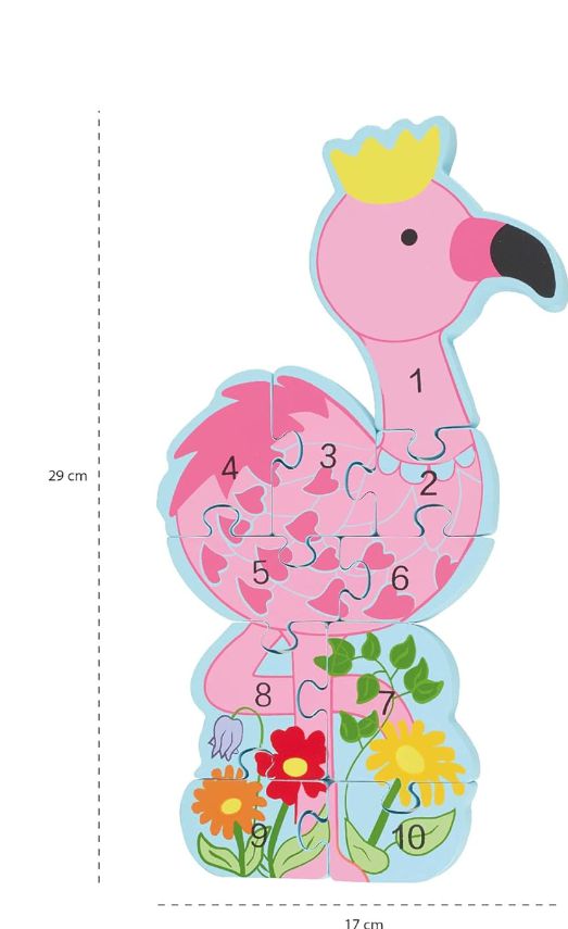 Make learning numbers a delightful adventure with the Flamingo Number Puzzle, a charming 10-piece wooden jigsaw puzzle designed to introduce little ones to the numbers 1 through 10. Shaped like a friendly flamingo and adorned with vibrant colours and clear numerical markings, this puzzle is both engaging and educational.