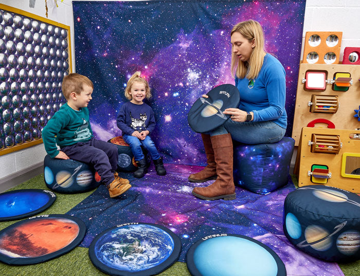 A large wall-hanging featuring a bright and vibrant image Galaxies, Nebulas and Stars