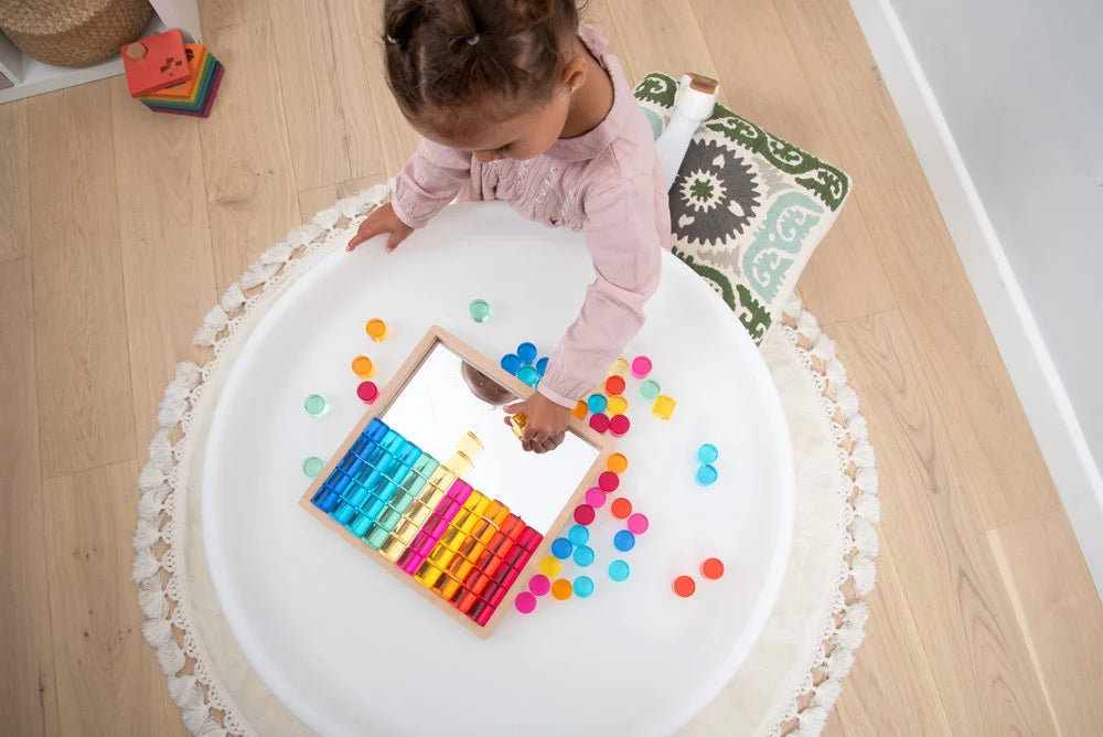 Delight in a world of vibrant colour and reflection with the Gem Circle Mirror Tray! This stunning play set includes 100 crystal-coloured gem circles crafted from solid acrylic in 10 different colours, each with smooth, polished edges. Presented in a durable beechwood tray with a mirrored base, the gems reflect light beautifully, creating a bright and colourful space that captivates and encourages creative play.