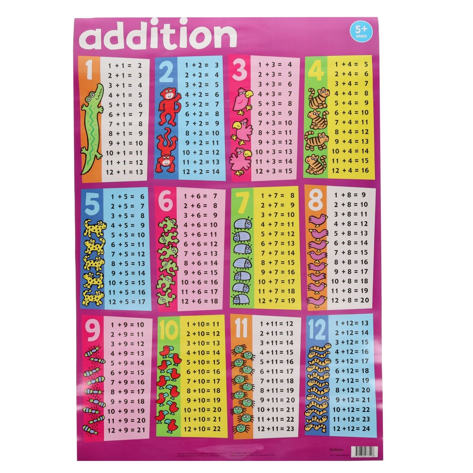 • Three Vibrant Learning Wallcharts: Each chart is dedicated to a key mathematical concept—addition, times tables, and counting. The bright colours and lively pictures make these wallcharts not just educational but super fun.