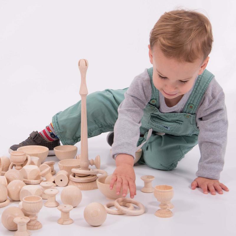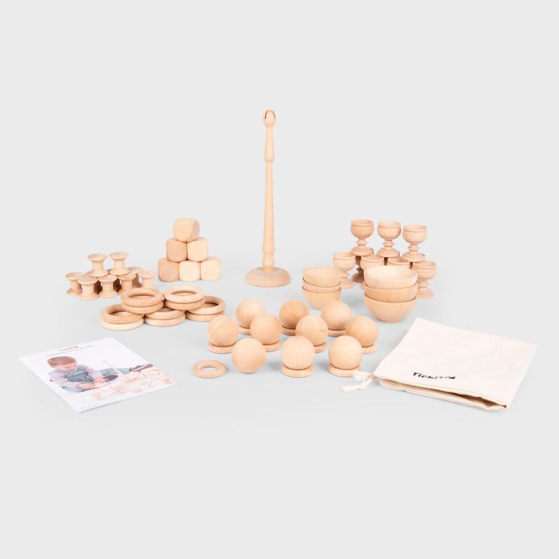 This carefully curated 63-piece set includes a variety of smooth, solid beechwood items—from spools and bowls to rings and cubes—that aren’t traditionally seen as toys, but are endlessly fascinating to little hands. With no rules or instructions, children are free to stack, roll, sort, and discover through self-directed play, strengthening their motor skills, coordination, and creative thinking along the way.