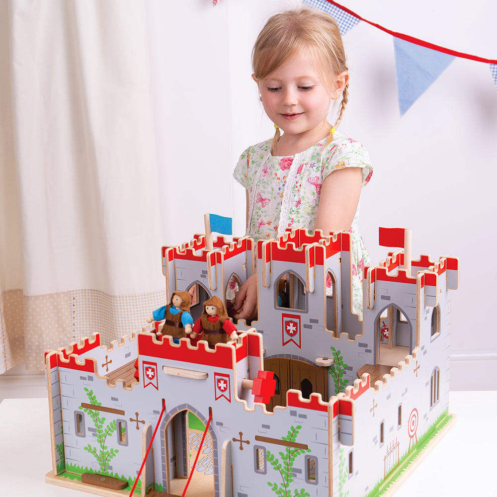Keep the knight toys enemies out with the fully functioning drawbridge, and remove the red or blue flag depending on who has claimed the castle. Endless role-playing possibilities abound inside this absorbing wooden castle toy where the magic lives on forever. Just be sure to stay on your guard!