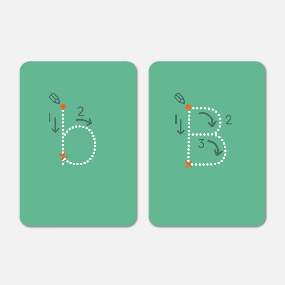 The pack includes both lower and uppercase letters, along with numbers from 0-9. Each card features clear start and endpoints, and instructional arrows to guide with letter formation.