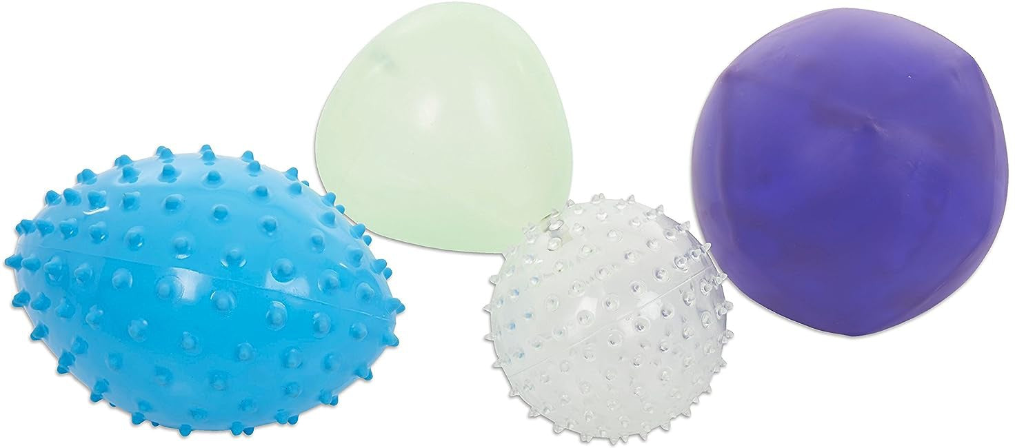 A set of four inflatable balls in distinctive and unusual shapes and with different surface textures and colours. Great fun for throwing, catching, rolling and bouncing as the irregular shapes make them move in unpredictable directions, challenging expectations and hand-eye coordination.