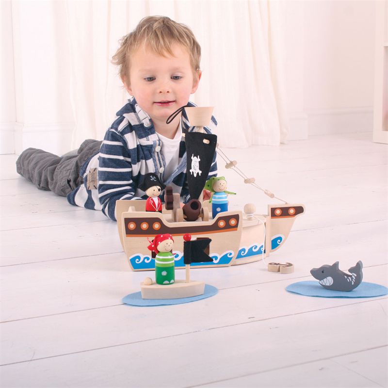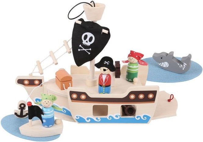 "Ahoy, Captain!" Jolly sailors will adore this wooden Mini Pirate Ship Toy, supplied complete with a captain, two pirates, boat, anchor, treasure chest and even a shark!