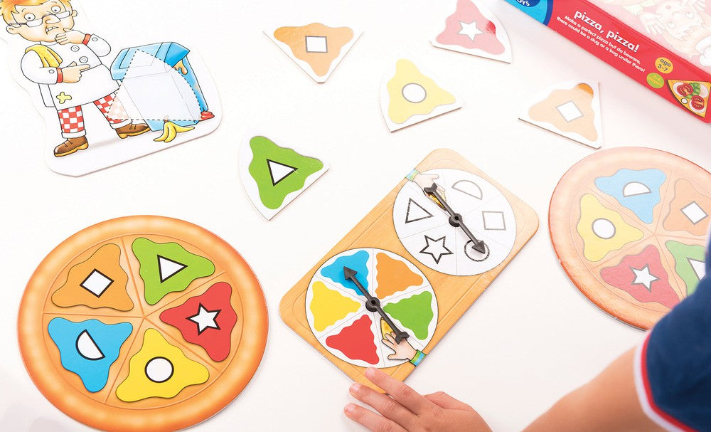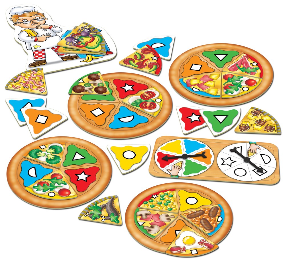 An exciting colour and shape matching game for all the family. Spin the double spinner and choose a topping card by colour or shape. The winner is the first person to fill their pizza board, but watch out for the yucky toppings that need to go in the bin!