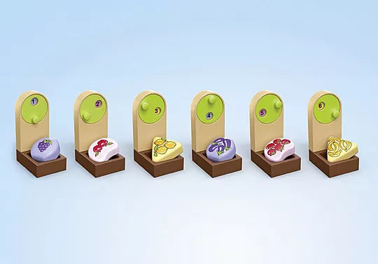 Let your child explore the world of market shopping with the Playmobil® JUNIOR: Organic Market Stall & Forklift, where they can engage in fun, interactive play while learning about colours, shapes, and quantities.