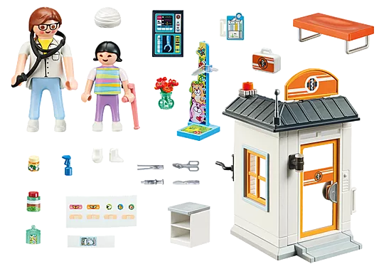 The perfect introduction to the PLAYMOBIL worlds! The young patient is examined by the paediatrician, and casts are applied. Welcome to the friendly PLAYMOBIL paediatrician's office where little patients are lovingly cared for. A girl has had an accident, and the helpful paediatrician carefully examines her on the examination couch, gently listens to her chest with a stethoscope, bandages her head wound, and applies a cast to her broken arm. Everything will heal with a few days of rest. PLAYMOBIL Starter Packs offer an ideal introduction to the colourful PLAYMOBIL world, including parts of a building, two figures, and great extras. These sets are quickly assembled and ready for play, with age-appropriate accessories perfect for children aged four and up. Includes plaster labels for individual sticking.