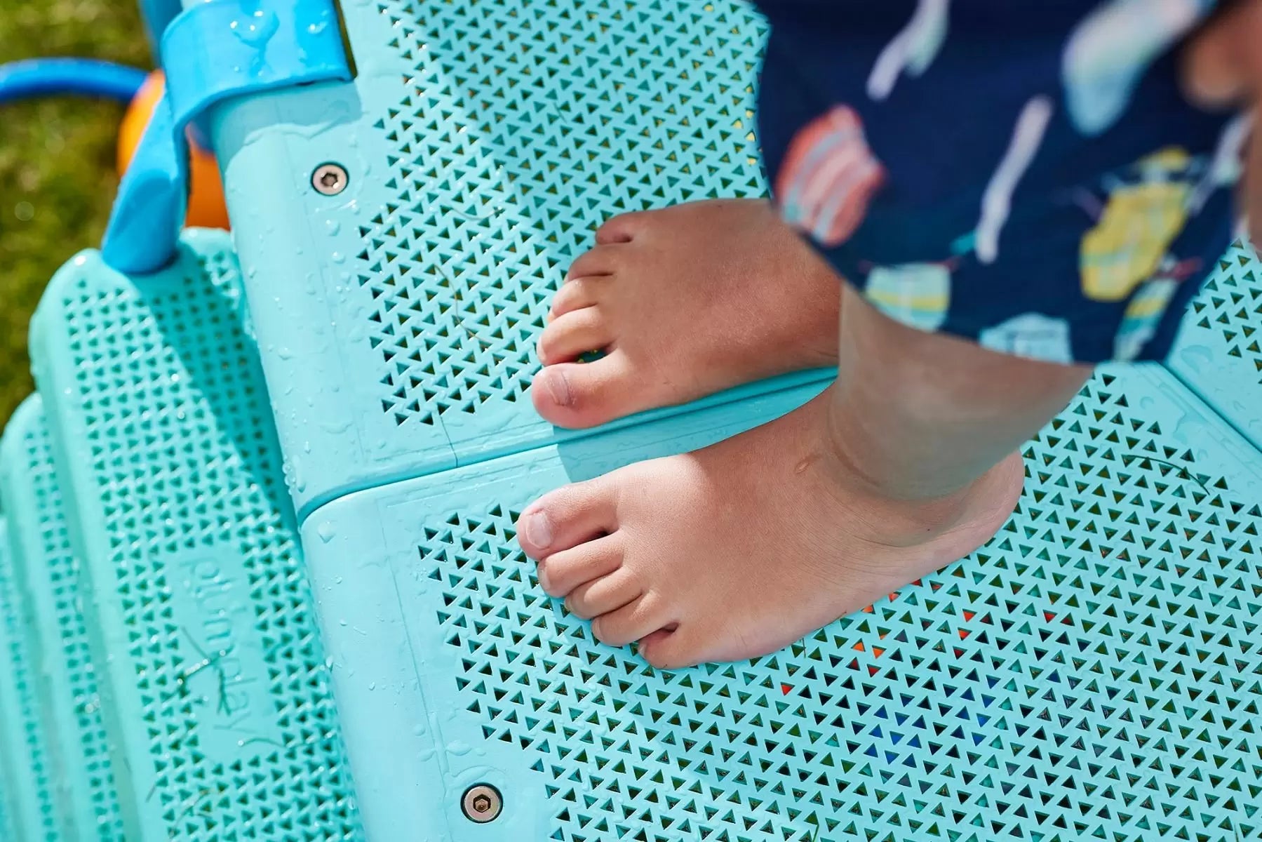 - Slip-resistant play platform and steps with grip texture and water drainage for safe play