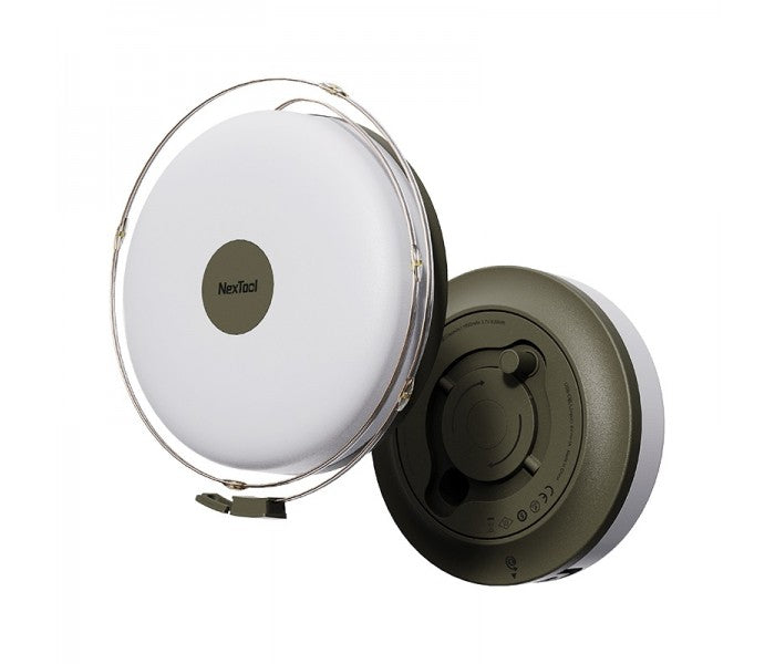 Multifunctional outdoor lighting device combining a 200-lumen main lamp with a 10-meter ambient string light. It features a patented hand crank for retracting the string light, IPX4 waterproofing, and a 1800mAh rechargeable battery