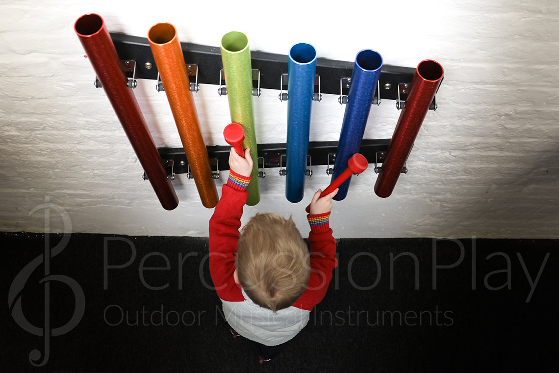 These chimes' size and vibrant colours make them especially suitable for smaller establishments like nursery schools, pre-schools, and kindergartens. They are easy to securely install in the ground, on a wall, fence, or post. You can even bring the outdoors in by mounting them on an indoor wall.