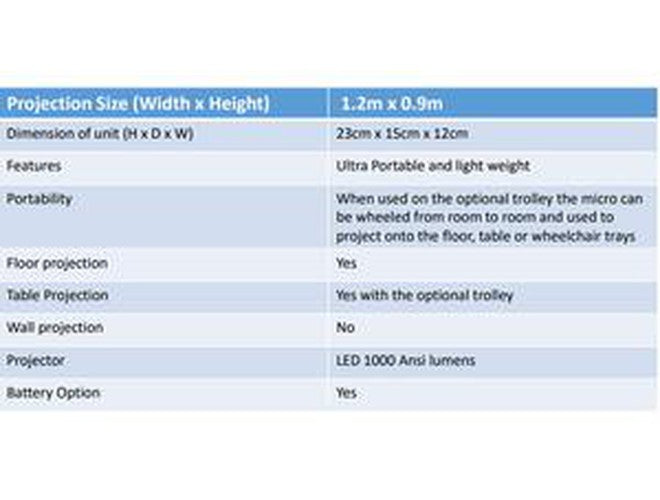 What would be the best size table to project onto? Do the images automatically project to the size of mat/table/tray being used? – the size of the table area is dependent on the height of the projector, you can resize the image if the table/wheelchair tray is smaller you can shrink the image down. Taking the projector higher up will increase the size of the projection but we do recommend with the micro that it be installed at around 1.2m high or if on the trolley you can play around with the heights to get the optimal size.