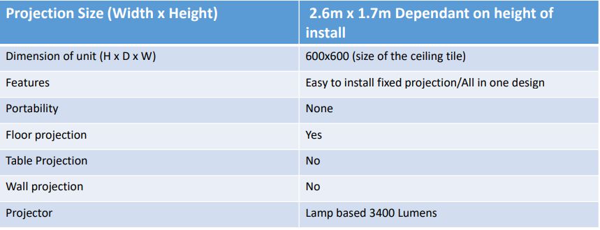 Easy Setup: Installation couldn't be simpler. Replace the ceiling tile in an existing suspended ceiling grid, connect the mains, and your interactive projection system is ready to go. (Please inquire if you don't have a suspended ceiling, and we can advise on the product's compatibility.)