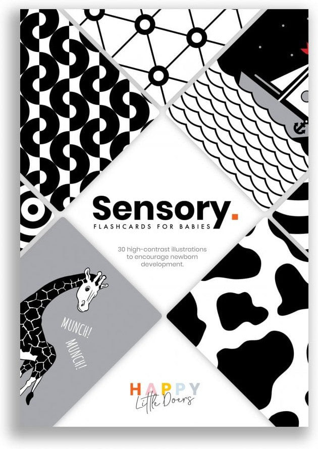 Our Sensory Flashcards for Babies are the perfect sensory gift for new parents and newborn babies. Designed to help newborn baby development through sensory play. Featuring 30 high-contrast illustrations of patterns, nature and animals, with a range of simple activities. Designed to improve tracking & focus, increase the attention span and encourage neck & physical strength during ‘tummy time’!