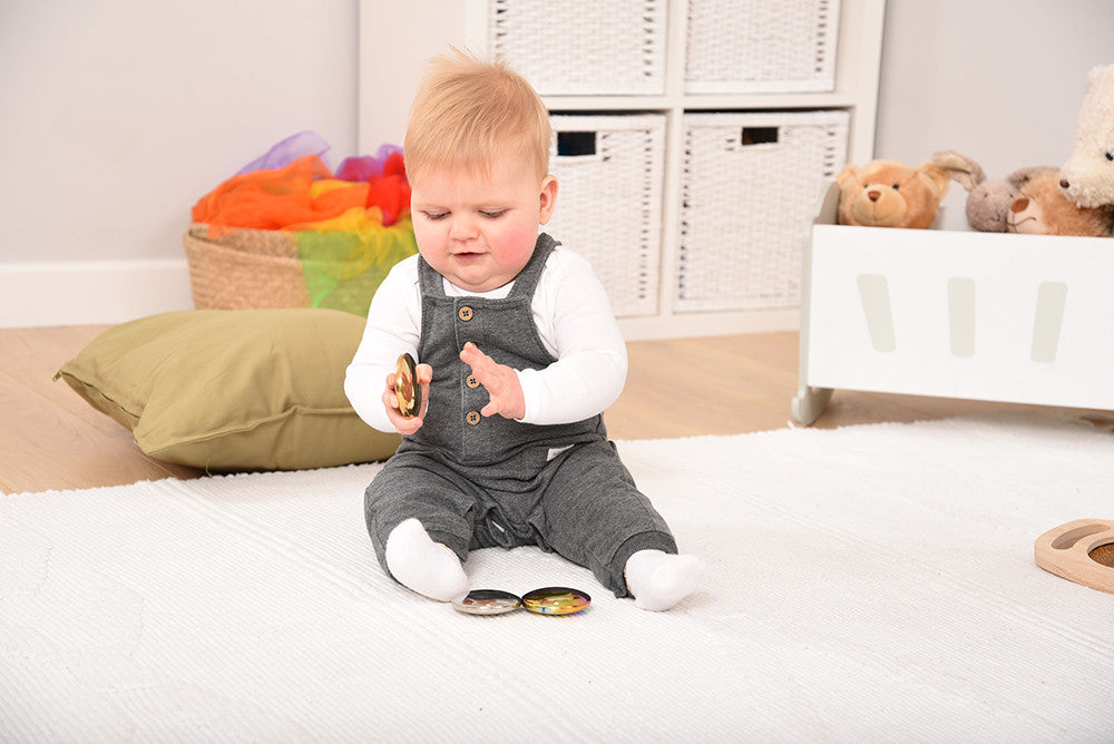 Robustly constructed from stainless steel in mirrored gold, silver and colour burst finishes, these 3 smooth and seamless discus shaped buttons have different contents to produce a range of sound effects. The hand finished mirrored surfaces provide a distorted fish-eye lens reflection which is fascinating for children to observe. The buttons are are lightweight and tactile to handle, making them of particular appeal to children with SEND.