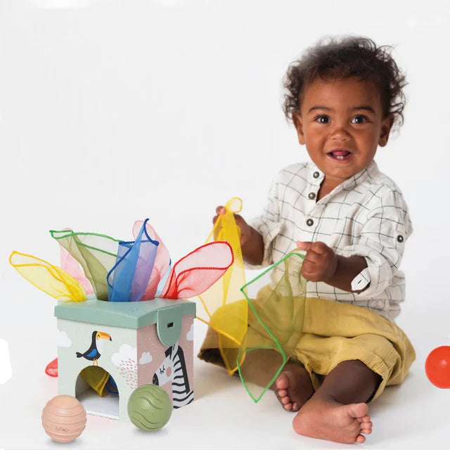 Whether used in the sensory space, school environment, or at home, the Taf Toys Magic Box Baby Toy helps to build fine motor skills and encourages interaction. With 5 colourful organza tissues and a set of double-sided feeding play cards, this toy ensures that your baby will be entertained for hours while enjoying safe, non-toxic play.