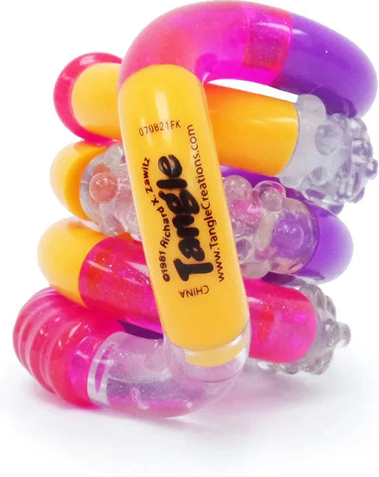 Tangle® Junior Texture, a captivating fidget toy designed to engage your senses with its mix of smooth and textured pieces, available in vibrant neon and clear colour combinations.