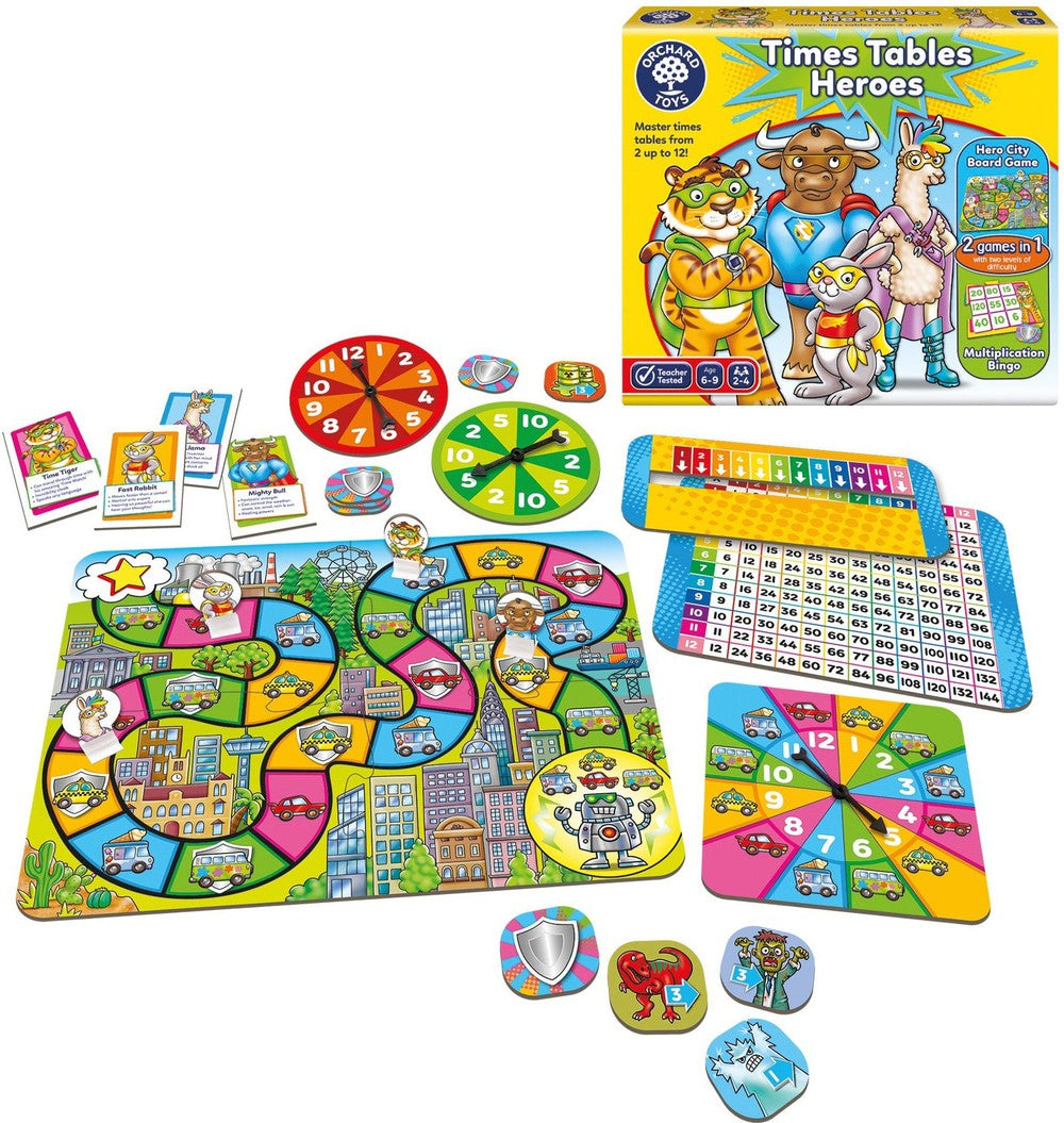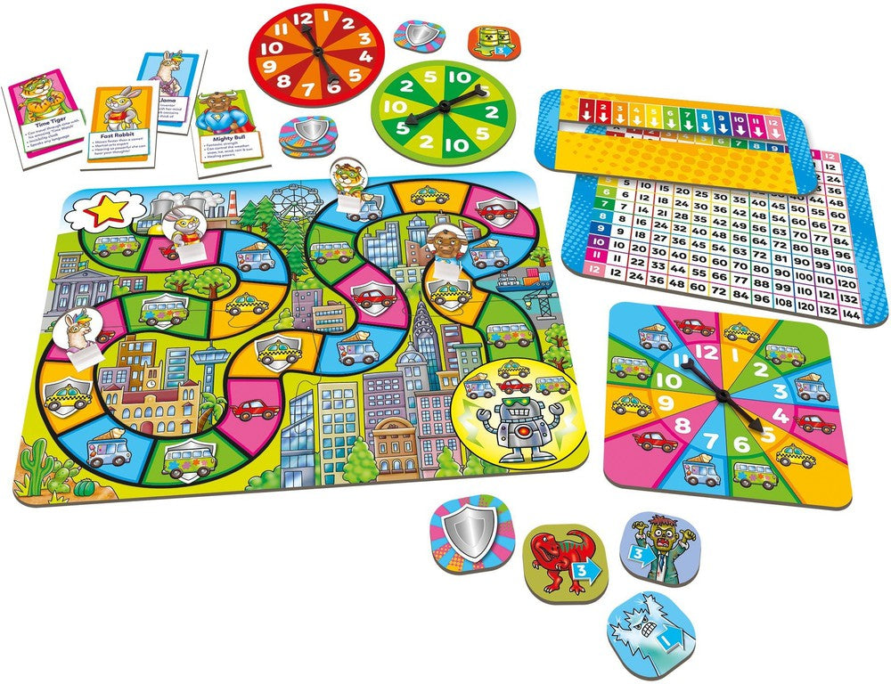 This fun multiplication game will help children practise their times tables from 2-12. With two games in one - Hero City board game and Multiplication Bingo - times table practise will be filled with fun!In the Hero City Board Game players move around the board by spinning the spinners and solving multiplication sums. If a player lands on a shield square they have to use their imaginations to help their superhero defeat the disaster - they'll need to defeat the evil unicorns, outwit the zombies or even escape the giant slugs! Times Tables Heroes also includes a colourful times tables checker, which can be used with or outside of the game to extend learning.When the game is finished players can turn over the board for a fast paced game of Multiplication Bingo! Using the cards and spinners from the board game, players race to be the first to get 3 in a row. This will be especially helpful for encouraging children to recall their times tables quickly.Times Tables Heroes is designed to help parents and children prepare for the multiplication tables check (MTC), which is compulsory nationwide in primary schools for children in Year 4 from June 2020.