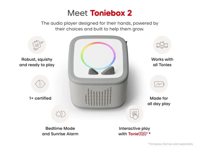 With upgraded features including a built-in sleep light, sunrise alarm and a dynamic light ring, Toniebox 2 is more than just a player – it’s a companion for play, rest and learning. It’s also compatible with Tonieplay, unlocking a whole new world of interactive games and challenges.
