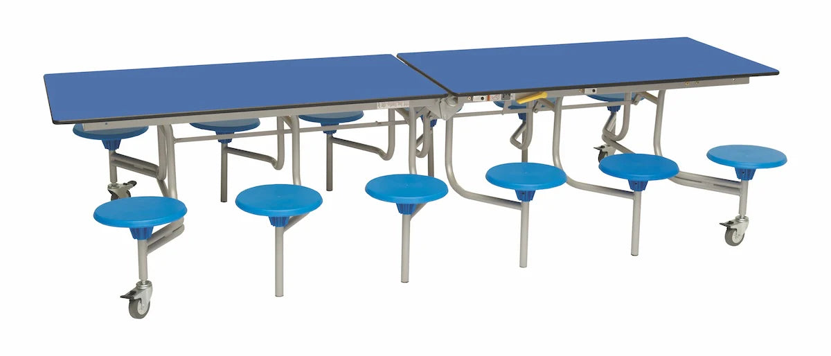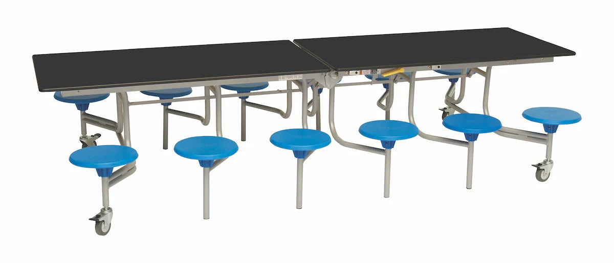 The Twelve Seat Rectangular Mobile Folding Table is a versatile, space-saving solution perfect for school canteens, event halls, or any dining space. Featuring a durable laminated table top with a water-resistant MDF core, this table is designed for everyday use. It easily folds for convenient storage and transportation, fitting through standard doorways. The heavy-duty locking castors and open position safety lock ensure maximum stability during use. With a range of customisable colours for the table top and stools, this mobile folding table is both functional and stylish.