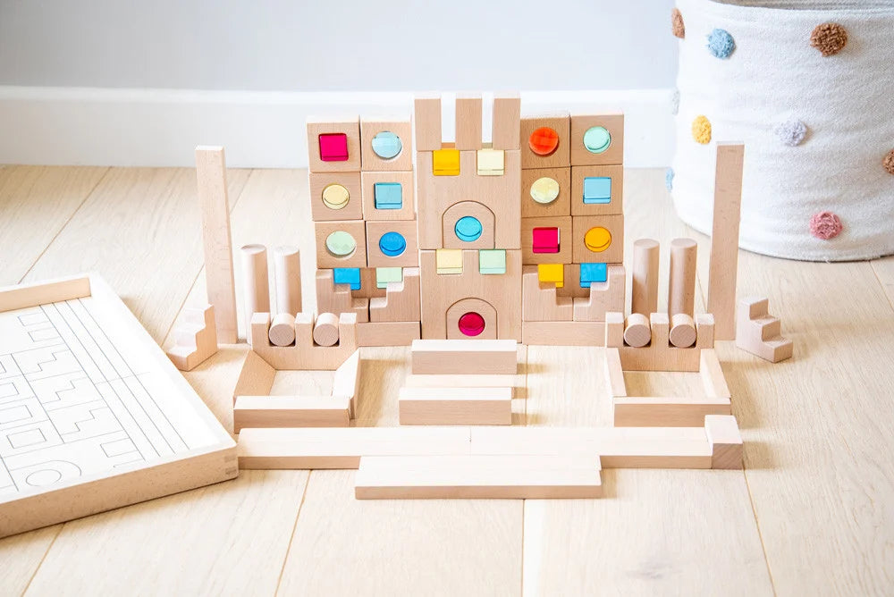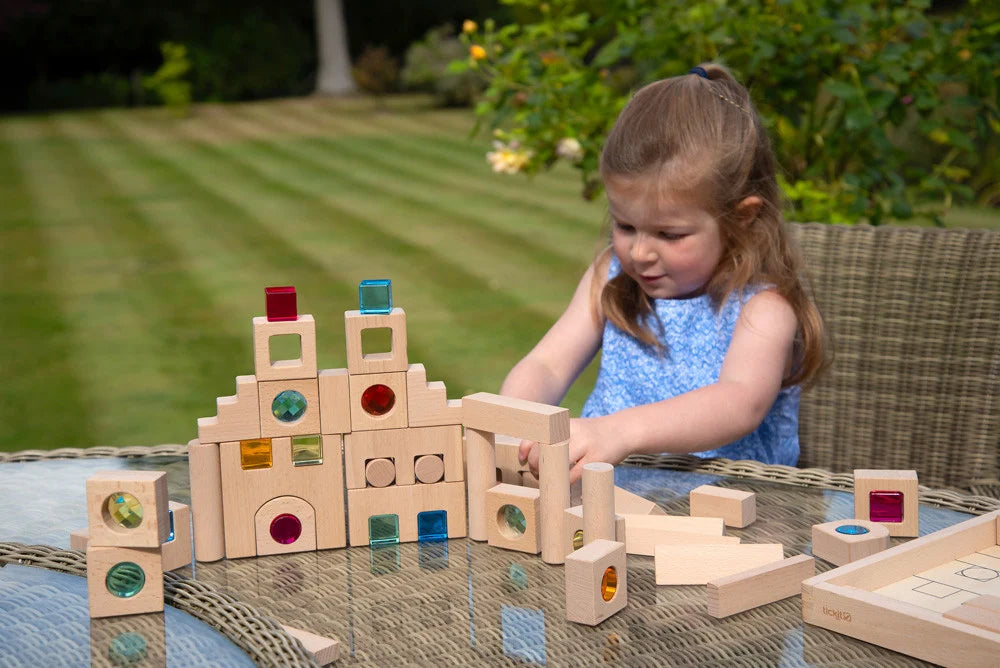 Each block is crafted to be open-ended, allowing for versatile use: younger children can engage in simple stacking and balancing, while older children will enjoy the freedom to design intricate structures. The kaleidoscope blocks provide a mesmerising view when looked through, while the gem circles and cubes add colourful, shiny details to constructions. Children can use these unique blocks to create windows, doors, and decorative elements in their play scenes, fostering descriptive language and story-telling skills.