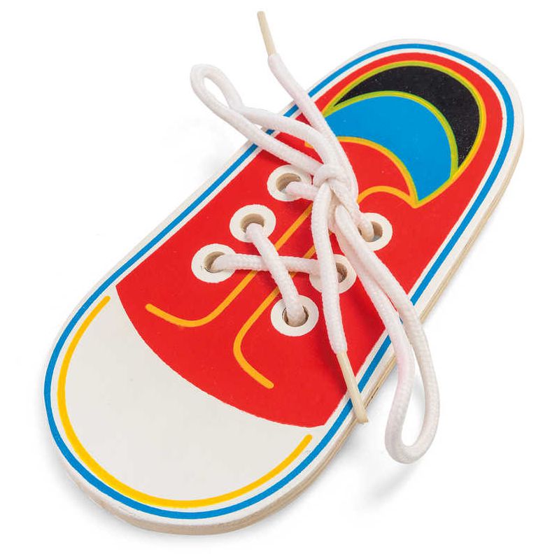 Wooden board painted to look like a shoe. This is a great tool for assisting small children in learning to tie their laces. The wooden board has been painted bright colours and features six holes with a rope threaded through them. Children can practice tying simple knots before moving on to bows and even double knots.