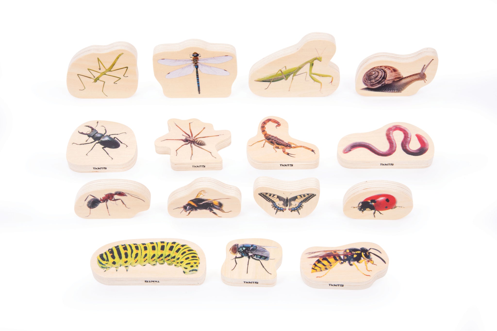 Wooden Minibeast Blocks (Pack of 15) – Double-sided picture blocks featuring minibeasts and woodland creatures.